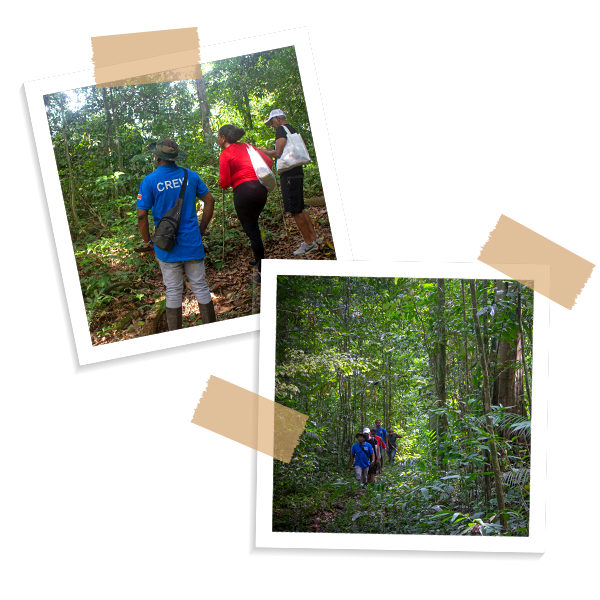 Discover and experience the jungle up close on the Lucie Trail. Take a challenging and adventurous forest walk with our experienced guides, taking around 2,5 to 3 hours. In the meantime, you will receive explanations and stories about the different trees, plants, medicinal herbs and flowers that you encounter on the hike and also wildlife because you hear and see a lot. Spot the mesmerizing blue Morpho Rhetenor butterflies and listen to birds sing their spectacular melodies... Something new awaits you around every bend of the narrow forest path. We visit places that beg to be photographed or to rest for a while. The forest has several creeks at different times of the year that we cross via a tree trunk bridge. We pass zwampen, the Surinamese jungle swamps that are the domain of the anaconda (aboma) and the spectacled caiman.